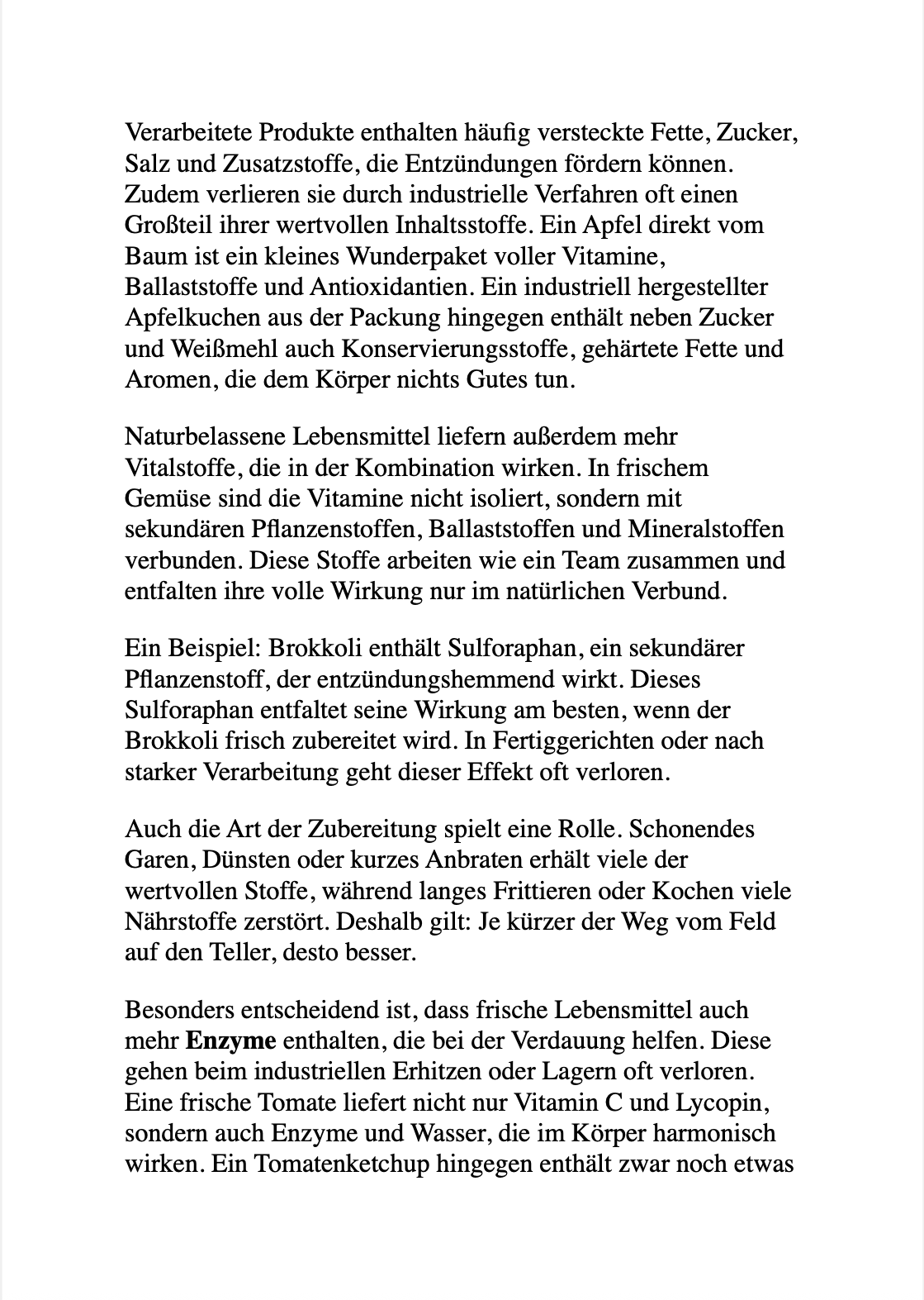 Du erfährst verständlich erklärt, warum Ernährung der Schlüssel zu echter Gesundheit ist, welche Lebensmittel Entzündungen im Körper anheizen und welche sie wirksam stoppen können. Zahlreiche alltagstaugliche Rezepte und praktische Tipps zeigen dir, dass gesunde Ernährung nicht kompliziert sein muss, sondern voller Genuss steckt. Ein klar strukturierter 7-Tage-Plan hilft dir, sofort einzusteigen und die Veränderungen schon nach kurzer Zeit zu spüren: mehr Energie am Morgen, ein leichteres Körpergefühl, weniger Schmerzen und ein stärkeres Wohlbefinden.