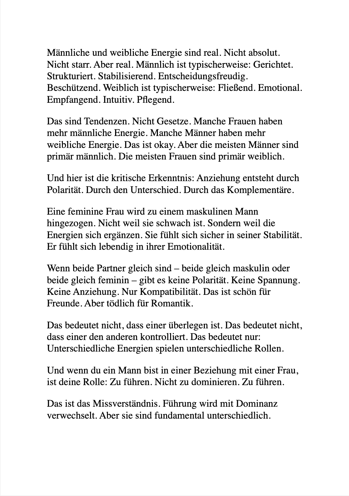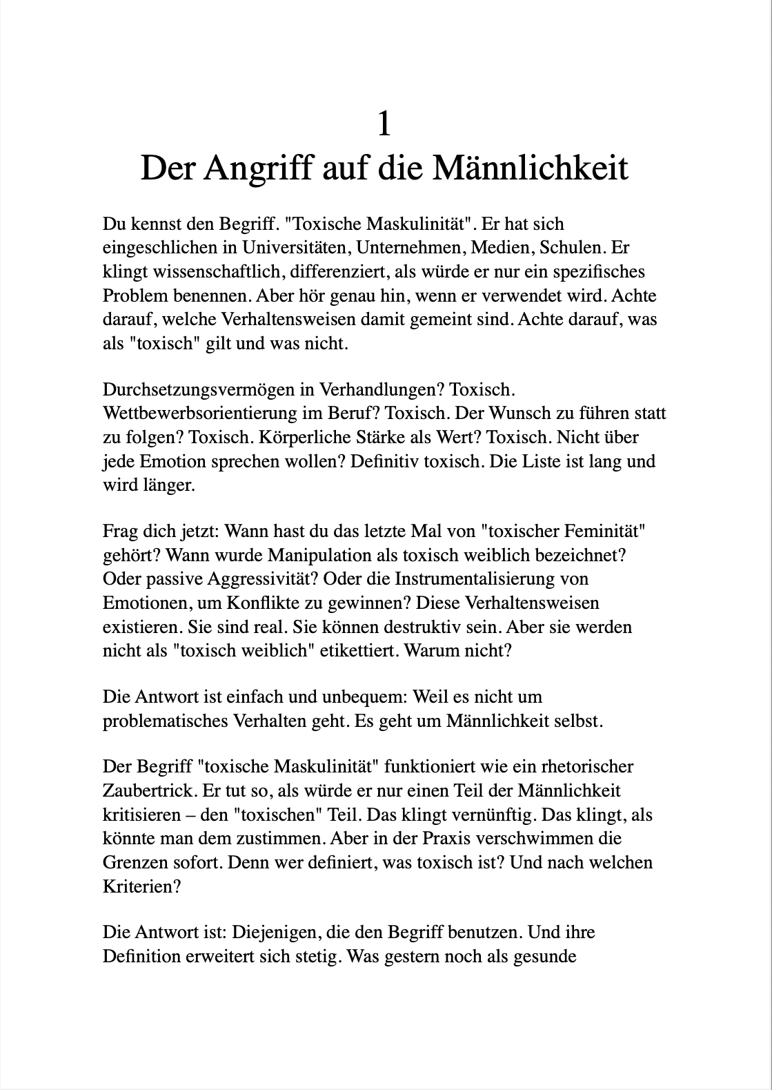 Du weißt, was Stärke ist. Du weißt, was Verantwortung bedeutet. Du weißt, dass Kompetenz, Zielstrebigkeit und Selbstbeherrschung einen Mann ausmachen. Aber dir wurde beigebracht, diesen Impulsen zu misstrauen. Sie zu relativieren. Sie zu erklären, statt sie zu leben.