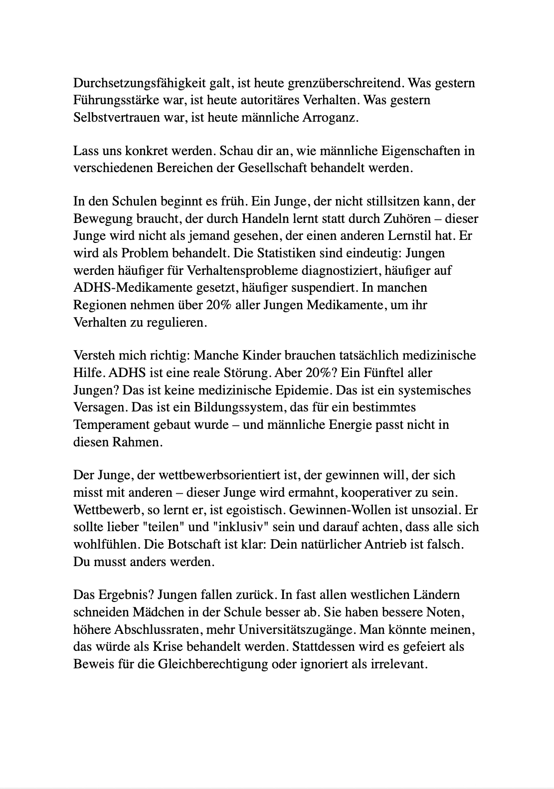 Eine ganze Generation von Männern kämpft mit widersprüchlichen Signalen. Jungen fallen zurück, Suizidraten steigen, immer mehr Männer leben ohne Richtung. Und anstatt nach Ursachen zu fragen, wird Männlichkeit weiter „dekonstruiert".