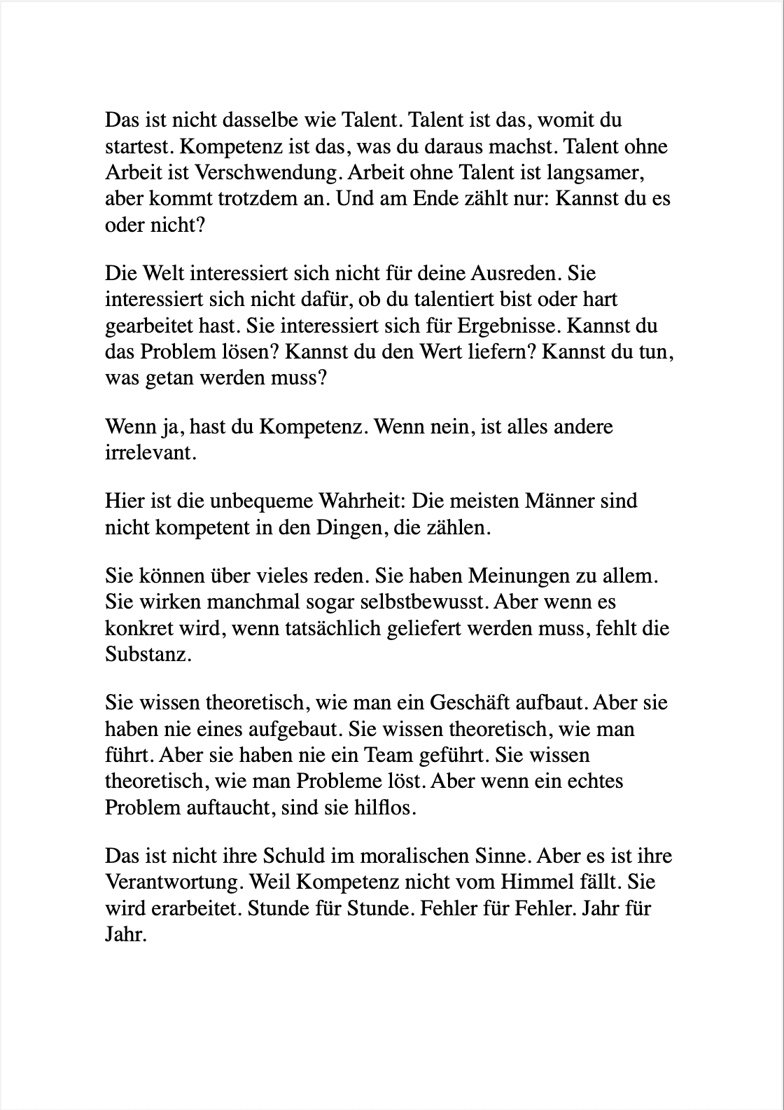 Dieses Buch gibt dir keine Streicheleinheiten. Es gibt dir Klarheit. Über das, was wirklich passiert. Über das, was einen Mann ausmacht. Über zeitlose Prinzipien, die funktionieren – unabhängig davon, was die Welt gerade von dir erwartet.
