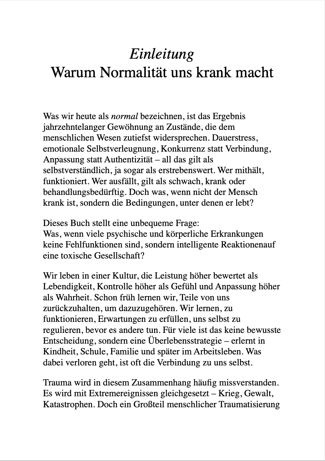 Dieses Buch lädt dazu ein, diese Signale ernst zu nehmen. Es verbindet psychologisches und körperorientiertes Wissen mit einer kritischen Betrachtung unserer gesellschaftlichen Normalität. Dabei geht es nicht um Selbstoptimierung oder schnelle Lösungen, sondern um ein tieferes Verstehen: Warum wir geworden sind, wie wir sind – und was wir brauchen, um wieder in Kontakt mit uns selbst zu kommen.