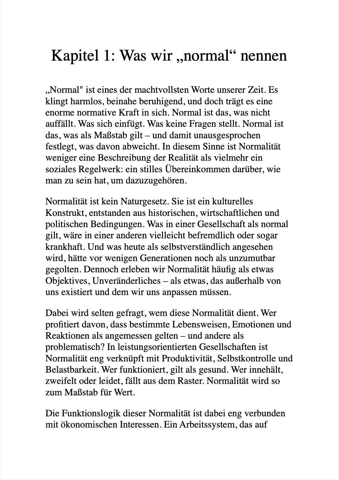 Dieses Buch verspricht keine einfachen Antworten. Aber es eröffnet einen Raum für Ehrlichkeit, Mitgefühl und die Möglichkeit, Normalität neu zu denken – als etwas, das dem Leben dient, nicht es einschränkt.