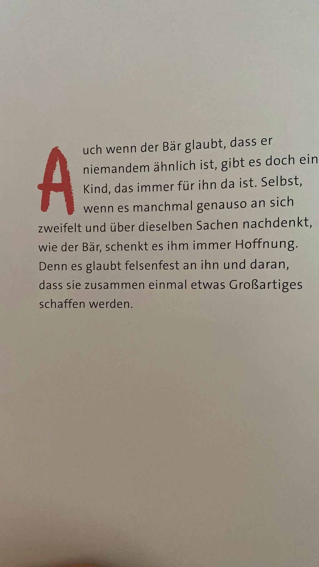 In dem Buch geht es um einen kleinen Bären. Dieser fühlt sich – wie wir alle so oft- unsicher und hat Angst, anders zu sein als die Anderen, dass er nicht dazugehört und die Anderen ihn nicht mögen.